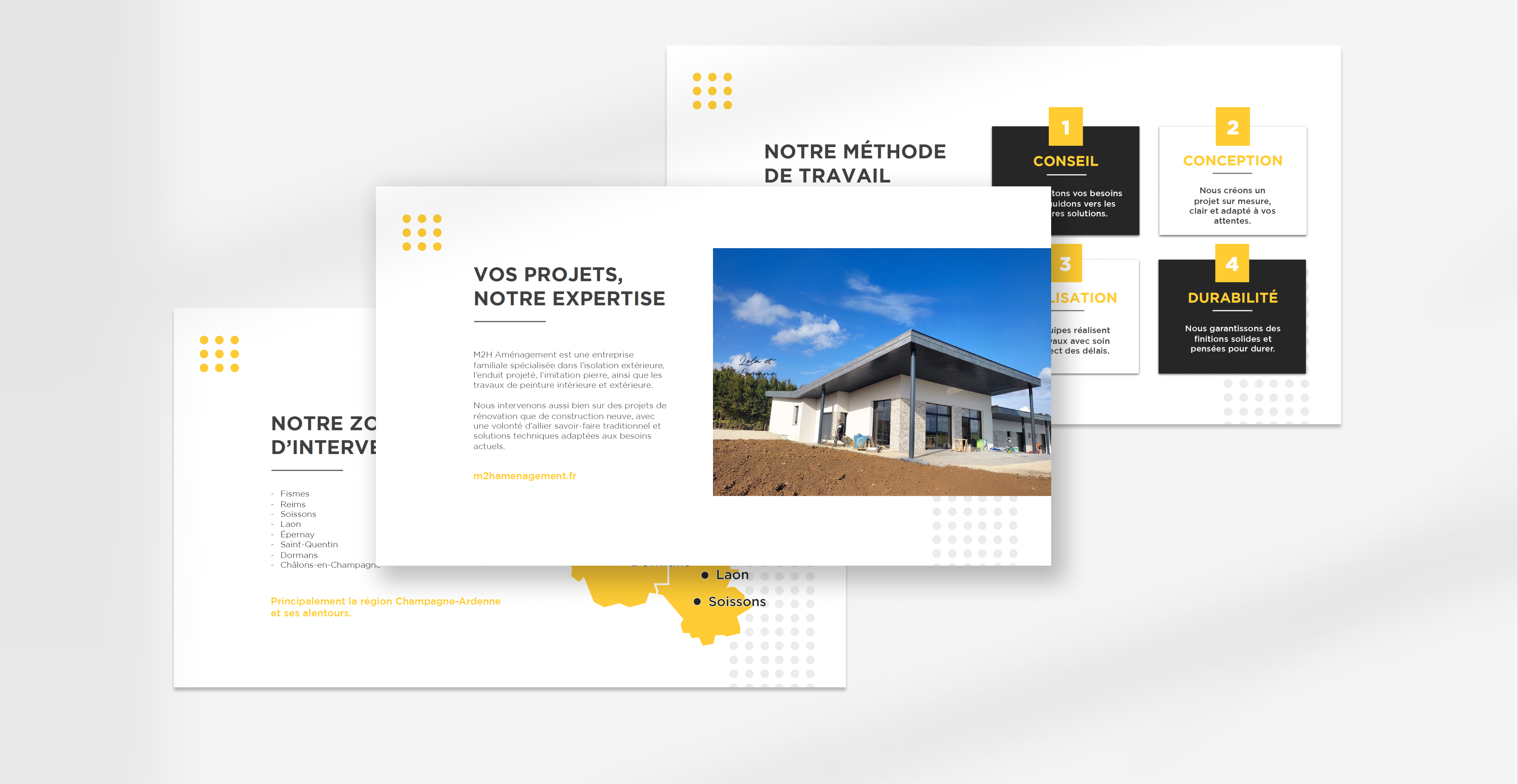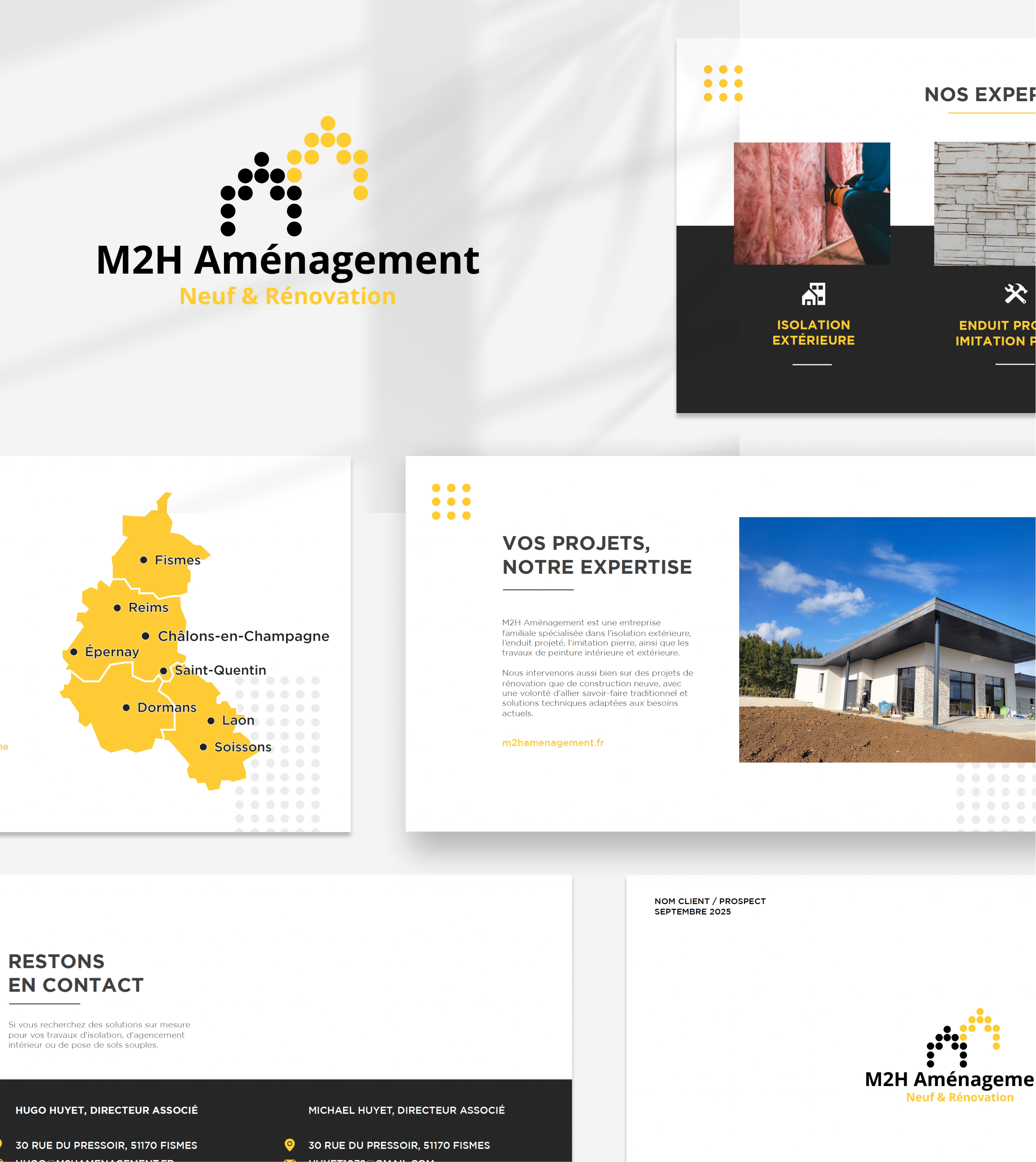 Implantée à Fismes, près de Reims, M2H Aménagement est une entreprise familiale reconnue pour son expertise dans l’aménagement et le bâtiment. Soucieuse de refléter la qualité de son savoir-faire jusque dans ses outils de communication, l’équipe a souhaité moderniser et structurer l’ensemble de ses supports.